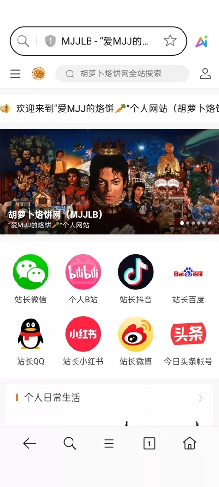 “爱MJJ的烙饼”个人网站(胡萝卜烙饼网)成立于2025年1月12日,是迈克尔·杰克逊中国歌迷自发创建的非营利性歌迷网上平台,也是一个集MJ资讯共享与MJ文化传播为一体的迈迷庇护所。
